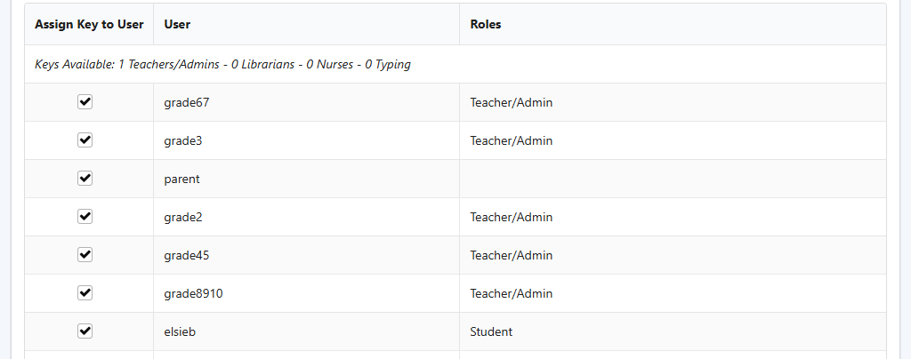 - The next screen allows you to choose the users to which you'd like to assign the key--the modules available are displayed across the top of the table